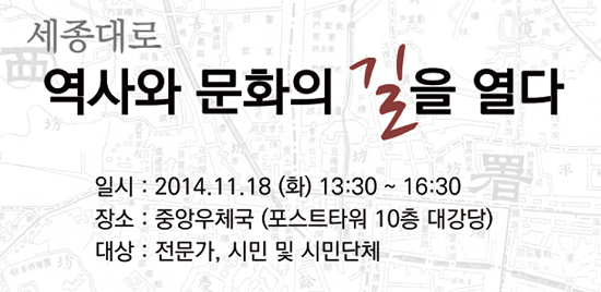 “세종대로의 역사적 장소성 회복을 통한 역사도시 정체성 강화” 기대 서울시는 오는 11월 18일(화) 13시 30분부터 중앙우체국 10층 대회의실에서 '세종대로, 역사와 문화의 길을 열다'를 주제로 세종대로 역사문화 특화공간 조성 관련 시민대토론회를 개최한다고 밝혔다.