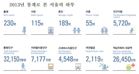 공개된 내용을 보면 서울시민 평균 나이는 39.7세, 인구구조는 유소년층은 적고 청장년층은 많은 항아리 형태를 띠고 있는 것으로 조사됐다. 2013년 말 기준 서울 인구는 1,038만 8천 명으로 전년 대비 54,371명 감소했고, 서울시민 10명 중 1명은 65세 이상이며 하루 평균 230명이 태어나고 115명이 사망했다. 하루에 189쌍이 부부가 됐고 55쌍의 부부가 이혼했으며 717만 7천 명이 지하철을, 454만 8천 명이 버스를 이용했고 하루 교통사고 사망자 수는 1.04명으로 나타났다. 소비자물가지수는 20년 전인 1993년과 비교했을 때 2배 상승했다. 대표적 외식메뉴인 자장면과 치킨은 2.2배, 시내버스요금은 4배, 목욕료는 3.3배 올랐다. 서울시가 1961년 이래 매년 발간하고 있는 ‘서울통계연보는 올해 제54회째로 지난 2013년 인구․경제․주택․교육․교통 등 20개 분야 345개 주요 통계를 통해 서울의 사회생활상을 엿볼 수 있다.