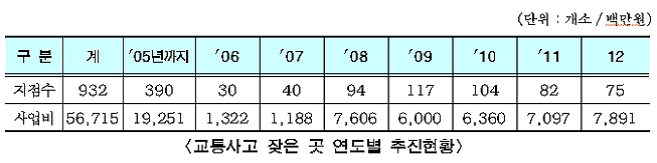 이 중 최근 3개년간(2008~2010년)의 개선사업 지점에 대해 모니터링한 결과, 사고건수는 2,664건에서 2,086건으로 약 22%, 사망자수는 4,159명에서 3,179명으로 약 24%가 감소하는 등 개선사업이 효과를 거두고 있는 것으로 나타났다.