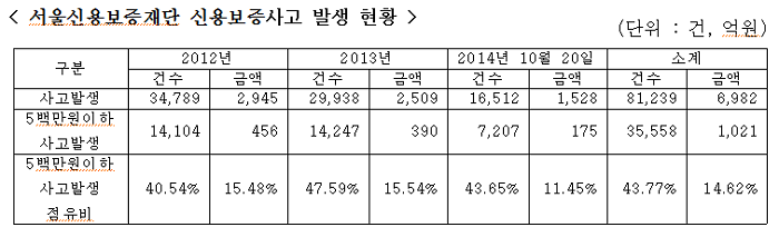 서울신용보증재단의 5백만원이하 신용보증사고에 대하여 하나뿐인 채권보전조치인 가압류가 법원에서 소액이라는 사유로 기각됐다. 서울시의회 김현아 의원이 서울신용보증재단 으로부터 제출받은 자료를 분석한 결과 최근3년간 81,239건, 6,982억원의 신용보증사고가 발생하였고, 5백만원이하 신용보증사고는 35,558건 43.77%, 1,021억원 14.62%를 차지하고 있는 것으로 나타났다.