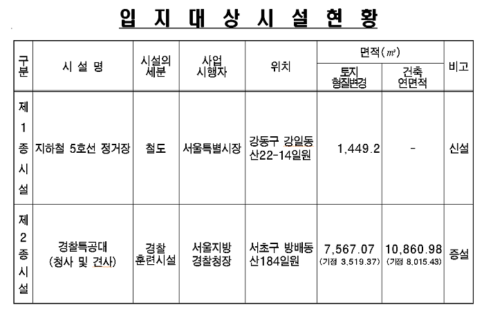 이번 입지대상시설은 총 2건이며, 지하철 5호선 정거장 신설은 강동외곽지역 교통난 해소 및 지역균형발전 도모를 위하여 지하철 5호선을 연장(하남선 : 상일역~강일지구~하남미사지구)하는 사업이며, 경찰특공대 증설은 노후 청사의 시설환경 개선과 지속적인 민원제기에 따른 견사 이전 사업이다.