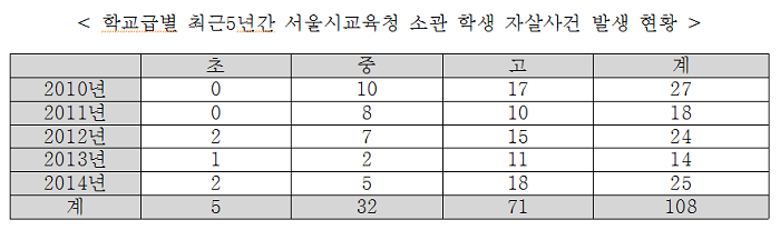 유청 서울시의원이 교육청으로부터 제출받은 「최근 5년간 서울시교육청 소관 학생 자살사건 발생 현황」을 분석한 결과 서울시교육청 소관 학교에서 2010년 27건, 2011년 18건, 2012년 24건, 2013년 14건, 2014년 25건 총 108건의 학생 자살사건이 발생한 것으로 나타났다.