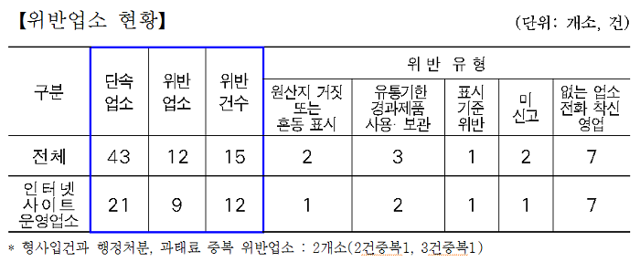 서울시 민생사법경찰과(이하 '특사경')는 설 성수식품 제조업소 83개소에 대해 지난 1월 28일부터 2월 9일까지(약 2주간) 기획수사를 펼친 결과, 12개소에서 「농수산물의 원산지표시에 관한 법률」, 「식품위생법」, 「전자상거래법」 등 15건을 위반한 것으로 드러났다고 11일(수) 밝혔다. 특사경은 전체 83개소를 현장점검 및 탐문한 결과 절반에 가까운 40개소는 업소가 존재하지 않았으며, 나머지 43개소에 대해 ▴위생관리 및 식재료관리 상태 ▴원산지 표시 위반 ▴유통기한 경과제품 보관·사용 ▴저질저가 식재료 사용 ▴무표시 ▴무신고 여부 등을 중심으로 수사했다고 설명했다. 적발된 위반 유형을 보면 마치 여러 개의 지점이 있는 것처럼 가상의 전화번호를 등록하고 실제로 전화를 걸면 실제 영업하는 1개 업소로 착신되게 하는 신종 판매수법이 7건으로 전체 위반 건수의 절반 가까이 차지했다.