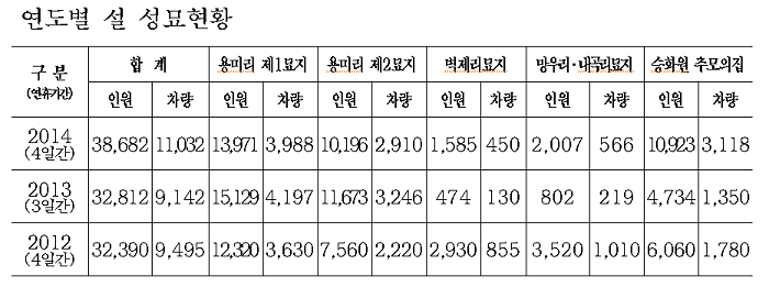 서울시설공단 이용노 추모시설운영처장은 “이번 연휴기간에 서울시설공단이 운영하는 15개 장사시설에 성묘객 5만여 명, 차량 1만여 대 이상이 몰릴 것으로 예상한다”며 “가급적 설 연휴 이전 미리 성묘를 해주실 것을 권장한다”고 밝혔다.