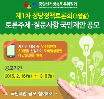 중앙선거방송토론위원회는 3월 말 개최예정인 제1차 정당정책토론회의 토론주제 및 질문사항을 국민제안을 통해 공모를 시행한다.