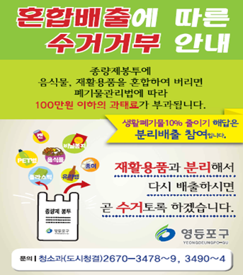 영등포구는 적극적인 분리배출 안내를 통해 주민의식을 전환하여, 생활 쓰레기 배출량은 줄이고 재활용률은 높인다는 계획에 따라 일반쓰레기와 재활용품, 음식물 쓰레기가 혼합되어 버려진 종량봉투에 수거거부 스티커를 부착하고 다시 분리해서 배출하면 수거해갈 예정이다. 계속해서 혼합배출이 이루어질 경우 최고 100만원의 과태료를 부과할 방침이다.