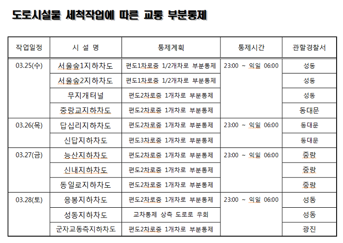 도로시설물 세척작업에 따라 2015년 3월 25일(수) 22:00부터 3월 29일(일) 06:00까지 시설물별 도로 일부 차선의 교통이 통제되는 터널 및 지하차도는 서울숲1지하차도(성동구) 외 11개소이다.