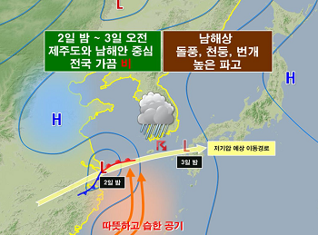 전국 기온은 아침 최저기온 9~16도, 낮 최고기온 20~30도로 낮과 밤의 기온 차가 10도 내외로 커 건강관리에 유의해야 할 것으로 보인다. 또한, 전 해상에서 안개가 짙게 끼는 곳이 있겠고, 일부 내륙에서도 새벽부터 아침 사이에 안개가 끼는 곳이 있겠으니, 교통안전과 해상 안전사고에 특히 유의가 요망된다. 5월 2일 밤 ~ 3일 오전 : 남해안과 제주도 중심 전국 가끔 비 남해 상을 지나는 저기압의 영향으로 2일(토) 밤에 서쪽 지방부터 비가 시작되어, 3일(일) 새벽에는 전국 대부분 지역으로 확대되겠으며, 오후에 대부분 그치겠음. 이번 비는 강수량이 많지 않고, 지역적인 차이가 크겠다. 2015년 5월 2~3일 예상 기압계 모식도 특히, 2일(토) 밤부터 3일(일) 새벽 사이에 남서풍에 의해 수증기가 유입되는 가운데, 지형적인 효과가 더해지면서 남해안과 제주도에서는 다소 많은 비가 오는 곳이 있겠으며 2일(토) 밤부터 3일(일) 사이에 남해 상과 제주도 해상에는 바람이 강하게 불고 물결이 높게 일 것으로 예상된다. 기상청 관계자는 “돌풍과 함께 천둥·번개가 치는 곳도 있을 것으로 예상된다”며 조업하는 선박은 주의를 당부했다. 5월 4일 ~ 5일 : 가끔 구름 많고 평년 수준 기온 비가 그친 후 어린이날(5일, 화)까지는 고기압의 영향을 받아 전국이 가끔 구름이 많은 날씨가 예상되어 야외 활동하기 좋을 것으로 예상된다. 다만 북쪽의 약한 한기가 남하하면서 일시적으로 기온이 떨어져 평년과 비슷한 기온 분포를 보이겠고, 낮과 밤의 기온 차가 클 것으로 전망된다.