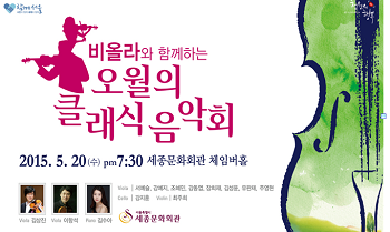 세종문화회관은 ‘2015 천원의 행복’ 그 세 번째 프로그램 ‘비올라와 함께하는 <오월의 클래식 음악회>’를 오는 5월20일(수) 오후 7시 30분 세종문화회관 체임버홀에서 공연한다.