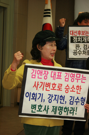 사법연대는 마지막으로 “항소심 재판장은 공판을 재개하여 이러한 범죄행위에 대해 진상확인을 한 후 판결을 해 주시기를 바란다”고 강조했다. 한편 오는 20일 선고가 예정되어 있는 H씨 부부사건과 관련 사법연대가 15일 기자회견을 통해 공판재개를 요청한데 이어 피해자측의 변호인 또한 15일 '공판재개를 위한 진정서'를 제출했다. 여기에 더해 16일에는 검찰에서도 이례적으로 '재개신청'을 재판부에 요구했다. 피해자측과 검찰의 이 같은 공판재개 요청에 대해 같은날(16일) H씨 부부 변호인 들은 '검사의견서에 대한 반박의견서를 제출'하는등 공판재개 요구와 이를 막기 위한 공방이 한참인 가운데 재판부가 이 같은 논란을 어떻게 수용할 것인지가 주목된다. 대선후보에게 ‘고위공직자특별수사청’ 사법연대의 15일 행사에서는 H씨 부부의 형사 사건에서 무죄가 선고된 것과 관련한 의혹이 제기된데 이어 전직 부장검사 출신 김기준 변호사에 의한 피해사례가 발표돼 눈길을 끌었다. 이인애씨는 “김 변호사는 2000년 8월경 경기도 남양주시 수동면 소재 임야 거래와 관련 5억 2천만 원을 자신이 없는 틈을 타서 임야 매수인 최 모 씨로부터 불법적으로 돈을 받아 갈취해 갔다”고 주장했다. 이와 관련 이 씨와 김 변호사는 이 돈의 성격을 둘러싸고 민형사상 재판이 진행중인데 <시사인>은 지난 10월 18일 ‘김 변호사의 처제 최 아무개의 법정증언이 위증일 가능성이 높다’고 보도했다. <시사인>은 이 기사에서 계속해 ‘고검 수사팀은 정밀 재감정 등을 통해 필적의 주인이 누구인지 확인하려는 실체적 진실규명 대신 서둘러 이 사건을 무혐의 처분했다’ ‘검찰이 과학적 증거마저 외면한 채 전직 검찰 간부 가족이 연루된 사건에서 제식구 감싸기식 구태를 벌인 게 아니냐는 의혹이 일만한 대목’이라고 보도한바 있다. 이인애 씨는 김 변호사의 이 같은 불법행위로 인해 “각각 100억, 45억이 넘는 집과 공장, 심지어는 딸 둘의 통장까지 뺏기고 옥탑 방에 살고 있다”며 눈물로 호소했다.