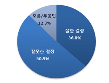 25일 박근혜 대통령이 ‘국회법 개정안’에 대해 거부권을 행사한 것과 관련하여 국민의 절반인 50.9%가 잘못한 결정이라고 응답했다. 잘한 결정은 36.8%, 무응답은 12.3%로 조사됐다.