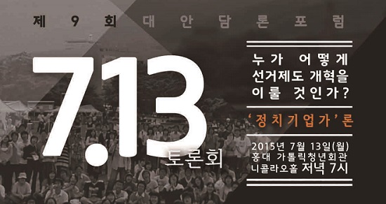 “누가 어떻게 선거제도 개혁을 이룰 것인가? ‘정치기업가‘론” 시민원탁토론회가 7월 13일(월) 저녁 7시, 홍대 가톨릭청년회관 5층 니콜라오홀에 열린다.