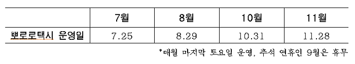 서울시는 7.25(토)부터 광화문광장이 위치한 '세종대로'에 뽀로로택시 임시승차대 2개소를 설치하고 오는 11월까지 매월 마지막 토요일 12~16시 '뽀로로택시 승차체험 이벤트'를 진행한다고 밝혔다. 서울시는 작년 11월, 개인택시 20대의 외관을 뽀로로 캐릭터로 포장하고 '뽀로로택시'를 운영하기 시작했으나 택시의 운행 특성 상 배회영업을 하다 보니 뽀로로택시를 타고 싶지만 쉽게 탈 수 없었던 시민들께 승차 기회를 제공하기 위해 행사를 기획했다고 설명했다. 뽀로로택시는 세종대로 교보빌딩 앞과 세종문화회관 세종홀 앞, 두 곳에 설치된 임시승차대에서 탈 수 있다. 추석연휴가 포함된 9월을 제외하고 오는 11월까지, 4차례 진행되고 한 회당 뽀로로택시 9대 씩 투입된다.