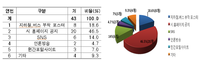 희망광고의 소식을 접하게 된 매체로는 시 홈페이지 46.5%로 가장 높았으며, 지하철, 버스 포스터 18.6%, SNS 14.0%, 기타 9.3%, 민간포털사이트 7.0%, 언론방송 4.7%로 나타났다.