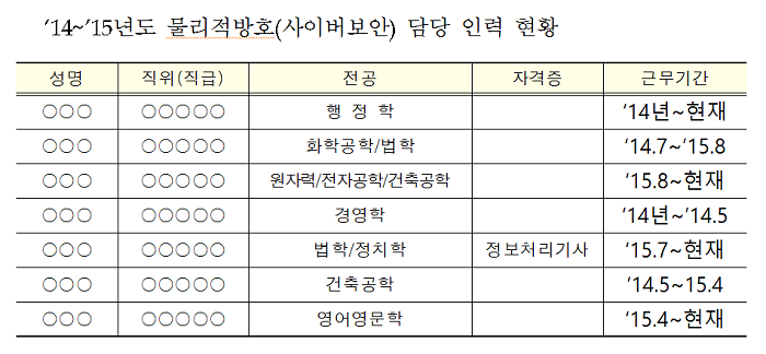 사이버 보안 담당 인력 근무 기간도 2년 미만 최근 원전 사이버 보안의 중요성이 강조되면서 한국수력원자력과 한국원자력통제기술원의 보안인력이 확충되고 있는 가운데, 원자력발전소 안전규제기관인 원자력안전위원회에는 원전 사이버 보안 전문가가 전혀 없는 것으로 드러나 충격을 주고 있다.