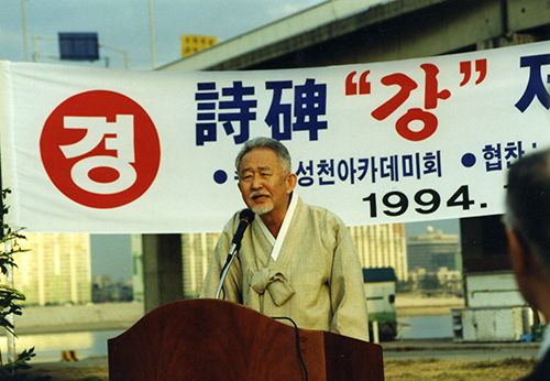 구상 시인은 33년을 영등포구에 거주하며 주옥같은 작품을 남겼다. 영등포구는 구상시인이 시의 소재로 즐겨 삼은 강(江)의 역사적 의미를 되새기고자 2010년부터 (사)구상선생기념사업회와 공동으로 구상한강백일장을 개최하고 있다. 올해로 제6회를 맞는 구상한강백일장은 오는 10월 10일(토) 여의도 한강공원 구상 선생 시비 주변에 펼쳐진다. 세계 200대 문인에 선정된 시인 구상 구상 시인은 문화적인 자존심이 강하기로 유명한 프랑스에서 뽑은 세계 200대 문인의 한 사람으로 우리나라에서는 유일하게 한 자리를 차지한 시인이다. 구상(1919년~2004년)은 1946년 원산 문학가동맹에서 펴낸 시집 ‘응향’ 필화사건에 휘말려 월남한 후 연작시 ‘강’, ‘모과옹두리에도 사연이’, ‘시집 구상’, ‘초토(焦土)의 시’, ‘그리스도 폴의 강’, ‘타버린 땅’, ‘유치찬란’, ‘밭과 강’, ‘드레퓌스의 벤취에서’ 등 10여 권이 넘는 시집과 수상집, 수필집 등을 펴냈으며 팔순에 다다른 시기에도 시집 ‘인류의 맹점(盲點)’을 발표해 문학에 대한 열정과 정갈한 노시인의 깊이를 보여줬다. 그의 작품은 일찍부터 불어와 영어, 독어, 스웨덴어 등으로 번역돼 세계 문학사의 한 페이지를 장식하며 문학을 사랑하는 각국 사람들의 가슴에 감동으로 전해지고 있다. 구상의 문학세계 유유히 흘러가는 한강을 바라보며 걸레처럼 더럽고 추례한 내 마음을 그 물에 헹구고 씻고 빨아 보지만 절고 찌들은 때들은 빠지지 않는다. ‘근황’ 중에서- 지극히 자기 고백적인 성찰의 시다. 구상시인은 이렇게 평생을 기독교적 존재관으로 살며 그것을 투명한 시적 예지로 받아냈다. 그러면서도 한국의 건국신화와 선불교적 명상, 노장사상까지 포용하는 사상적 기반을 바탕에 두고 시를 써왔다. 맑고 투명한, 거기에다 사상적 통합을 시로써 이루어낸 시인이라고 할 수 있다. 삶을 노래하는 구도자 구상 시인은 또 하나 남다른 것이 있었다. 그것은 어려서부터 너무나 종교적인 분위기에서 자란 때문인지 문학은 항상 인생의 부차적인 것이요, 주된 것은 종교, 즉 구도요, 그 생활이었다. 그래서 구상 시인은 일본에 가서 대학에 입학할 때도 명치대학 문예과와 일본대학 종교과에 모두 합격하였는데 결국 종교과를 선택했다. 그리고 그는 자신의 신심을 가다듬기 위하여 복음의 묵상서《나자렛예수》와 신심시선《말씀의 실상》을 펴냈다. 문학가의 자질은 어머니에게서 구상 시인은 자신의 문학적 감수성은 어머니로부터 길러진 것 같다고 한다. 천자문, 동몽선습, 명심보감 등 한문의 기초과정과 고시조, 신소설, 한글 토가 달린 삼국지연의, 수호지, 옥루몽 등 중국 소설을 어머니로부터 배웠다. 어머니는 멋도 모르는 구상 시인에게 자신이 소설의 줄거리나 그 재미있는 대목을 곧잘 들려 주었고, 또 시조도 이것저것 따로 외게 했다. 이러한 조기 교육으로 구상 시인은 보통학교에 들어가서 조선어(즉 국어) 과목이나 글짓기, 이야기 시간은 누구보다 뛰어났으며, ‘염소의 뱃속에는 기계장치가 있어 그 똥이 검정콩알처럼 둥글둥글하게 되어 나온다!’ 등 어린이들이 다 함께 갖는 공상을 너무나 수월하게 현실화하여 천진하게 써내고, 이야기를 만들어 냈다. 강(江), 나의 회심의 일터 구상 시인은 산보다 강을 더 좋아했던 것 같다. 시인이 자란 원산시 외곽에 있던 덕원이라는 마을 앞에는 마식령 산맥으로부터 흘러와 송도원 바다로 흘러가는 적전강이 있었는데 구상 시인은 이 강을 바라보면 마음이 후련해지고 해방감을 맛보곤 했다고 한다. 그런데 구상 시인이 장성해 가면서 일반적인 경치나 풍경으로써의 강보다 인식의 대상으로써 강을 바라보게 된 것은 그리스도 폴이라는 가톨릭 성인의 설화와 헤르만 헤세의 소설 《싯다르타》를 접한 게 영향을 주었다. 거기 주인공들은 강을 회심의 수도장으로 삼고 있는 것이 공통점이다. 강에 대한 상념이 시인에게 강을 연작시의 소재로 삼게 했다. 여기에는 물론 시인이 여의도에 살아 날마다 한강을 마주하고 있고, 시골집도 왜관이라 낙동강을 자주 접하는 데서 오는 친근감이 작용했을 것이다. 시인은<강> 60편을 완성하면서 강을 회심의 일터로 삼았다. 구상 시인과 영등포 영등포의 대표 문화 인물 구상 시인은 대구 왜관 지역에서 활동하다가 1960년대 말부터 서울 신당동에 거주하다가 1971년 여의도에 시범아파트가 들어서면서 이사해서 2004년 작고할 때까지 33년 동안 살았다. 구상 시인은 여의도에서 살면서 여의도 윤중제(輪中堤)를 사색의 산책길로 삼아 칸트처럼 규칙적으로 거닐었다. 같은 아파트에 거주했던 사회운동가 성천 류달영(전 서울대 교수, 1911~2004) 선생과 1991년 사회교육기관인 <성천문화재단>(영등포구 여의도동 라이프빌딩 내 소재)을 설립하여 우리 국민의 정신생활과 생활문화 창달을 위한 고전, 현대, 미래학 교육을 실행하였다. 두 분이 작고한 후에도 <성천문화재단>은 지금까지 활발하게 사회교양 교육을 실행하고 있다. 문화적 풍토가 취약한 영등포에 구상 시인 같은 위대한 시인이 30년 넘게 거주했다는 것은 영등포 주민의 문화적 자긍심이 될 것이다. 구상 시