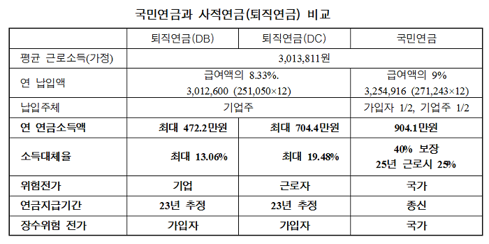 보고서에서는 DB형, DC형 퇴직연금과 국민연금의 연 납입액과 연금지급기간을 통해 연 연금소득액을 도출하여 소득대체율을 비교한 결과 월 평균 근로소득 301만 3,811원(전국 2인 이상 가구당 월평균 가계수지 기준)을 기준으로 25년을 근속한 것을 전제로 소득대체율을 추정했다.