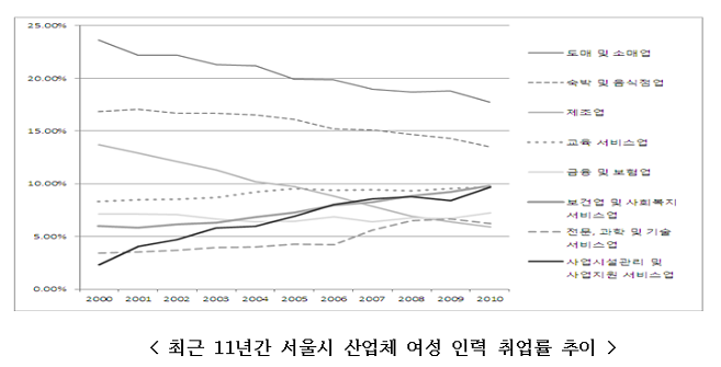 서울 여성직업군 '도․소매, 제조업' 쇠퇴 '보건․사회복지' 증가 서울시 여성능력개발원이 2000년~2010년 서울시 산업체(현재 72만 9,731개) 및 자치구별 여성종사자수를 분석한「여성 경제활동 활성화를 위한 서울시 자치구 산업별 현황조사」결과 서울여성들의 주요 취업 업종이 변화고 있는 것으로 나타났다.