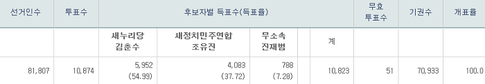 10월 28일 서울에서 유일하게 치러진 서울 영등포구 제3선거구(여의도동, 신길1·4·5·7동) 서울시의회 의원 재·보궐선거에서 새누리당 김춘수 후보(오른쪽 사진)가 새정치민주연합 조유진 후보를 누르고 당선됐다. 81,807명의 유권자 중 10,874명이 투표에 참여해 13.3%의 저조한 투표율을 보인 가운데 김춘수 후보는 5,952표(54,99%) 얻어 4,083(37.72%)을 얻은 조유진 후보를 1,869표 차로 따돌리고 당선됐다. 김춘수 의원은 당선 인사말을 통해 "지지해주신 지역주민 여러분들께 진심으로 감사드린다. 은혜 잊지 않고 영등포의 발전을 위해 분골쇄신하겠습니다"라고 밝혔다.