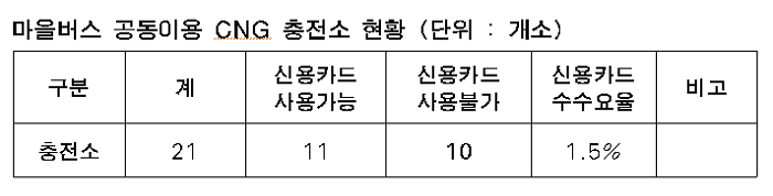서울특별시의회 전철수 의원은 “마을버스가 이용하는 일부 CNG 충전소에서 신용카드결제를 거부하고 현금만을 받고 있다”고 지적하고 이에 대한 개선을 촉구했다. 현재 서울시 천연가스 차량의 연료공급을 담당하고 있는 CNG 충전소는 46개소가 설치되어 있으며, 21개소는 시내버스 이외에도 마을버스가 공동으로 이용하고 있다.