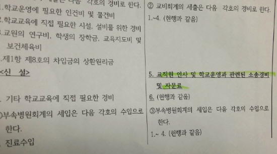 지난 3일, 교육부는 사립학교들이 '교직원 인사 및 학교운영과 관련된 소송경비 및 자문료'를 교비회계에서 지출할 수 있도록 한 '사립학교법 시행령 개정안'(제13조 제2항 및 제4항 개정)을 입법 예고했다. 교육부는 이 개정안에 대해 오는 4월 12일까지 사회부총리 겸 교육부장관(사립대학제도과장) 앞으로 전화(044-203-6930) 및 팩스(044-203-6909), 이메일(bravo2me@moe.go.kr)과 우편으로 찬반 여부 등 의견을 받겠다고 했다. 국민신문고(http://www.epeople.go.kr) 전자공청회 게시판에도 의견 개진이 가능하다. 교육부 관계자는 "사립대 · 법인 · 관련 단체들의 요구로 개정안을 만들어졌다"며 "입법예고 기간에 찬반의견을 받아 최종안을 마련하겠다"고 말했다. 그러나 교육부의 입법 추진 일정도 사회적 논란과, 야당의 강력한 반발을 피하기 위한 꼼수가 아니냐는 지적이 일고 있다. 전교조 사립위원회는 성명서에서 "시행령 개정안에 대한 의견 제출 마감일을 총선 하루 전인 4월 12일로 지정했다"며, "이것은 사회적 관심이 총선에 집중되는 시기를 틈타 형식적으로 의견 수렴, 총선 직후 슬그머니 발표, 시행함으로써 비판 여론의 화살을 피해보겠다는 꼼수로 의심받기에 충분하다."고 꼬집었다. 상위법 위반 및 대법원 판례와 교육부 방침에도 위배되는 '시행령 개정안' 만약 이 개정안이 국무회의를 통과하게 되면, 사학재단들은 학생들이 낸 등록금이 대부분을 차지하는 교비회계에서 지출할 수 있게 된다. 학교법인의 잘못된 인사나 운영으로 야기된 송사에 법인이 아닌 학생들의 등록금이 지출되게 되는 것이다. 지금까지는 사학의 교직원 해임 관련 소송비용에 대한 항목은 교비회계가 아닌 법인회계에서 지출해야 했다. 교육부는 '교비회계의 수입을 다른 회계로 전출할 수 없도록 규정'한 사립학교법 제29조에 근거하여 그동안 사학들이 교비회계로 소송비용을 지출했던 사학들을 사립학교법 위반사안으로 처벌해왔다. 실제로 수원대, 부천대 등 법인회계에서 집행해야 할 소송비용을 교비회계에서 집행해 교육부 감사에서 적발, 경고 및 시정 처분을 받은 바 있다. 이렇듯 상위법인 사립학교법을 위배할 뿐만 아니라 대법원 판례와 교육부 방침에도 어긋난다는 비판이 나오고 있다. 정의당 정진후 의원은 "소송비용의 교비회계 지출이 현행법상 횡령행위이고, 대법원에 의해 명백하게 횡령으로 판정된 사학법인의 불법을 합법으로 변경시켜주겠다는 것"이라고 질타했다. 반대 의견서 제출은 물론 개정 철회를 위한 모든 노력을 경주할 것 정대화 사학개혁국본 공동대표는 "소송비 등을 교비회계에서 지출할 수 있도록 사학법 시행령 개정을 시도하는 것은 대법원 판례를 부정하는 것이자 그간의 교육부의 정책과도 배치되는 모순적인 시도로서 사학을 관할하고 사학비리를 척결해야 할 교육부가 책무를 방기하고 오히려 사학분규를 조장하는 결과를 초래할 것이 분명하므로 즉시 철회하는 것이 마땅하다"고 강조했고, 김용섭 전교조사립위원장도 "이번 시행령 개정안은 사학의 교육공공성을 파괴하는 개악안으로, 교육부 스스로도 불법이라고 규정했던 사안을 시행령을 바꿔서 합법화시켜는 것은 반교육적으로 불법을 자행하는 것과 다름없다."며 "우리나라에서 사립학교가 차지하는 비율이 OECD국가들에 비해 기형적으로 높은 점을 감안하면 사학 운영의 공공성 훼손은 교육의 근간을 뒤흔드는 것이다. 따라서 시행령 개정안 입법예고는 철회되어야 마땅하다."고 일갈했다. 한국사립대학교수회연합회(이사장 박순준) 등 교수단체는 즉시 반발하며 교육부 항의방문 등 의사를 밝혔고, 사학개혁국본·참여연대 민생희망본부·민교협·사교련·교수노조·비정규교수노조·전교조 등 관련 단체들도 즉각 성명서 통해, "사학비리 단절에 나서야 할 교육부가 역주행을 하고 있다"며, "중 ‧ 고등학교 학부모 입장에서는 학생 교육활동비가 삭감됨으로써 자녀가 사립학교에 다닌다는 이유로 상대적으로 자녀의 교육활동에 피해를 입게 되는 것"이라고 비판하였다. 이들 단체는 또한 시행령 개정안의 입안 취지가 지극히 의심스럽다고 보고 있다."비리대학에 면죄부로 작용할 이번 시행령 개정안이 재판중인 특정 사안에 영향을 끼칠 수 있기 때문"이라며, "40가지가 넘는 비리가 확인되고도 소송비용의 교비지출 한 가지만 기소 후 정식재판에 회부되어 있는 수원대 이인수 총장의 판결이 이 개정안의 통과 여부와 무관하지 않다"고 보고 있다. 사학국본 등 관련 단체들은"한국의 교육환경을 극심하게 악화시킬 시행령 개정안을 반대하는 의견서 제출은 물론 개정 철회를 위한 모든 노력을 경주할 것을 엄숙히 선언한다"고 밝혔다.