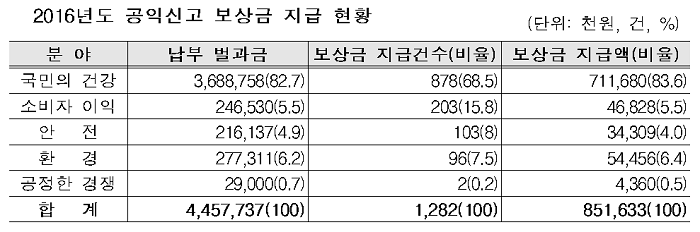 보상금은 국민의 건강분야에 전체의 83.6%인 7억 1천 1백여만 원이 지급되었으며 소비자 이익 분야 4천 6백여만 원, 안전 분야 3천 4백여만 원 순으로 나타났다. 보상금이 지급된 대표적인 사례를 보면 ▴제약회사로부터 리베이트를 제공받은 의사 9명이 약 3억 원의 벌금과 추징금을 납부함에 따라 이를 신고한 공익신고자에게 5천 4백만 원 지급, ▴자기 가족이 운영하는 약국에서 조제하도록 환자들을 유도한 병원 직원의 불법행위를 신고한 공익신고자에게 2백 3십여만 원 지급, ▴공장 건물을 해체하면서 석면 포함 여부를 조사하지 아니한 불법행위를 신고한 공익신고자에게 2백 4십만 원을 지급한 사례가 있었다. 이외에도 건강원 업주가 불법으로 진맥을 하고 뜸을 시술한 사례, 다중이용시설인 고시텔에 스프링클러를 설치하지 않은 사례 등 일상생활에서 볼 수 있는 다양한 공익신고가 있었다고 권익위는 밝혔다. 권익위는 작년 7월 개정되어 금년 1월25일부터 시행되는 공익신고자 보호법을 통해 보호조치 불이행 시 이행강제금을 2천만 원까지 부과하는 등 신고자 보호장치를 강화하였으며 보상금 지급액도 최고 20억 원으로 상향하였다. 권익위 관계자는 “공익신고가 사회의 고질적이고 다양한 공익침해행위를 예방․근절하여 투명한 사회 확립에 큰 효과를 가져 오고 있는 만큼 국민들의 적극적인 신고와 관심이 필요하다.”라고 밝혔다.