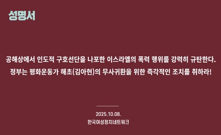 한국여성정치네트워크는 10월 8일 발표한 성명서에서 “2023년 10월 7일, 하마스의 기습 공격 이후 이스라엘은 가자지구에 대한 전면적인 반격을 감행했다”라며 “이러한 상황에서도 한국의 평화운동가 해초(김아현)는 인도적 구호 활동의 하나로 ‘가자로 향하는 천 개의 매들린 선단’에 탑승했다”라고 밝혔다. 이어 “그러나 오늘, 이스라엘군은 해초가 탑승한 구호선단을 공해상에서 나포했다. 이스라엘 정부는 선단 참가자들을 테러리스트로 규정하고 장기 구금을 경고해왔다”라고 밝히고 “현재 해초를 포함한 선단 참가자들의 안전이 심각하게 위협받고 있다. 국제형사재판소는 이미 네타냐후 이스라엘 총리를 전쟁범죄자로 규정하고 체포영장을 발부한 상태다”라고 설명했다. 한국여성정치네트워크는 그러면서 ▲정부는 자국민이 공해상에서 부당하게 나포된 사안에 대해 이스라엘 정부에 즉각적이고 강력한 항의를 표명할 것 ▲해초를 포함한 구호선단 참가자들의 안전 여부를 신속히 파악할 것 ▲해초의 무사 귀환을 위한 외교적 조치를 즉시 시행할 것 등을 촉구했다. 한국여성정치네트워크는 아울러 “정부는 자국민 보호와 인도주의 수호라는 기본적 책무를 저버려서는 안 된다. 해초의 무사 귀환과 팔레스타인 민간인에 대한 인도적 지원이 중단 없이 이어져야 한다”라고 덧붙였다.