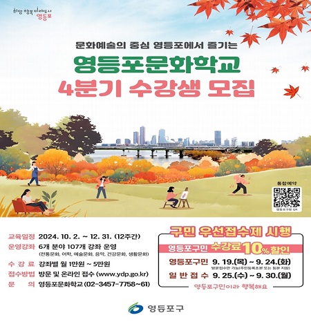 영등포구(구청장 최호권)가 ‘4분기 영등포문화학교 수강생’을 모집한다.